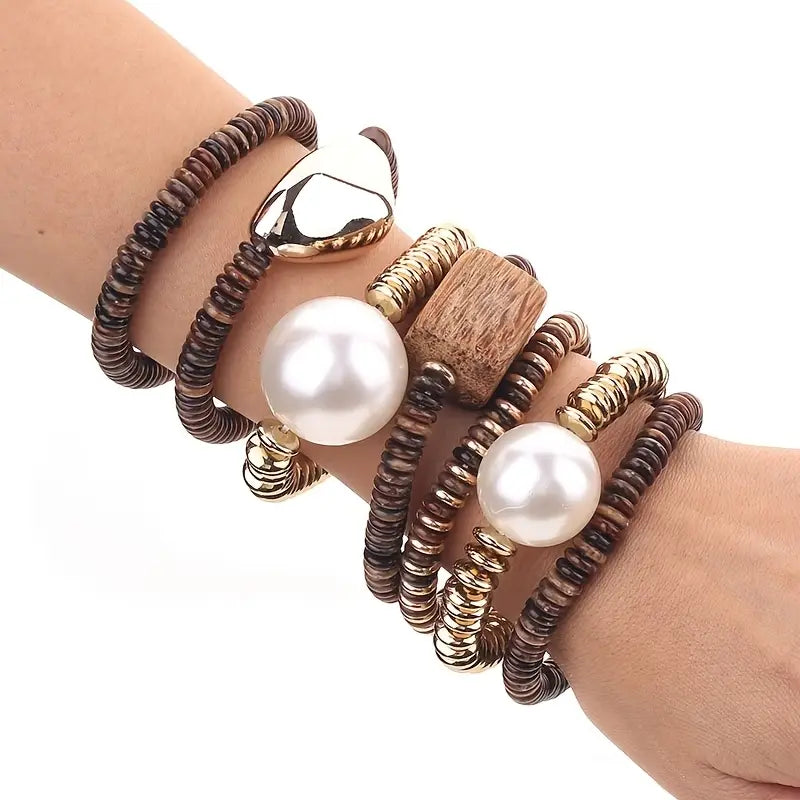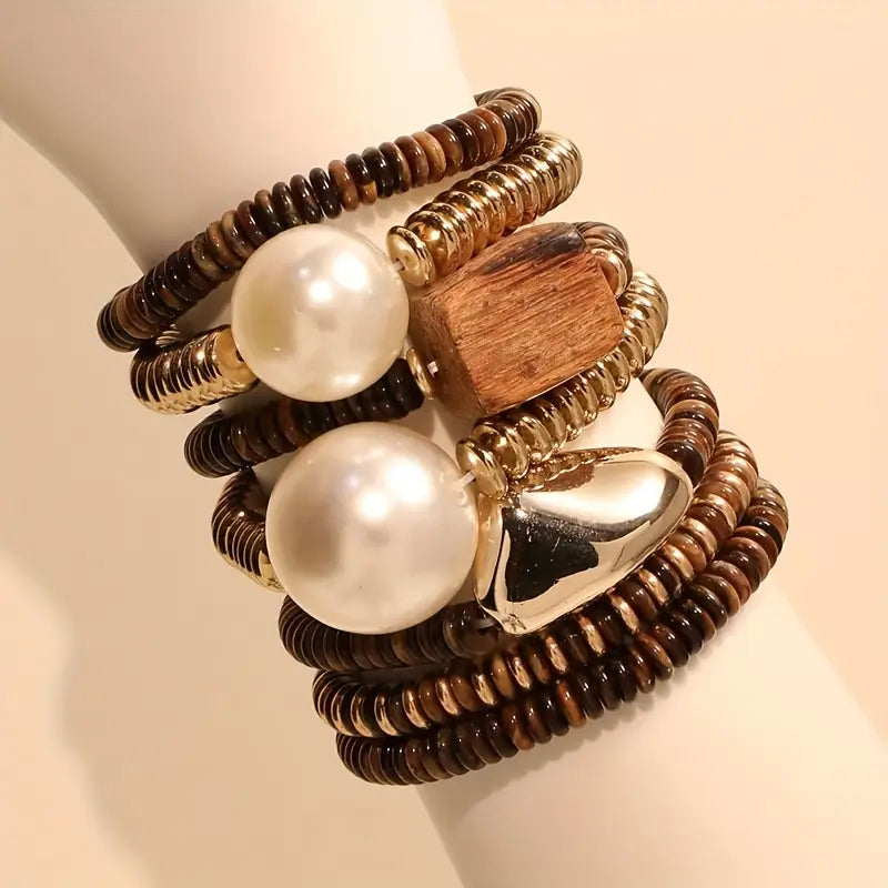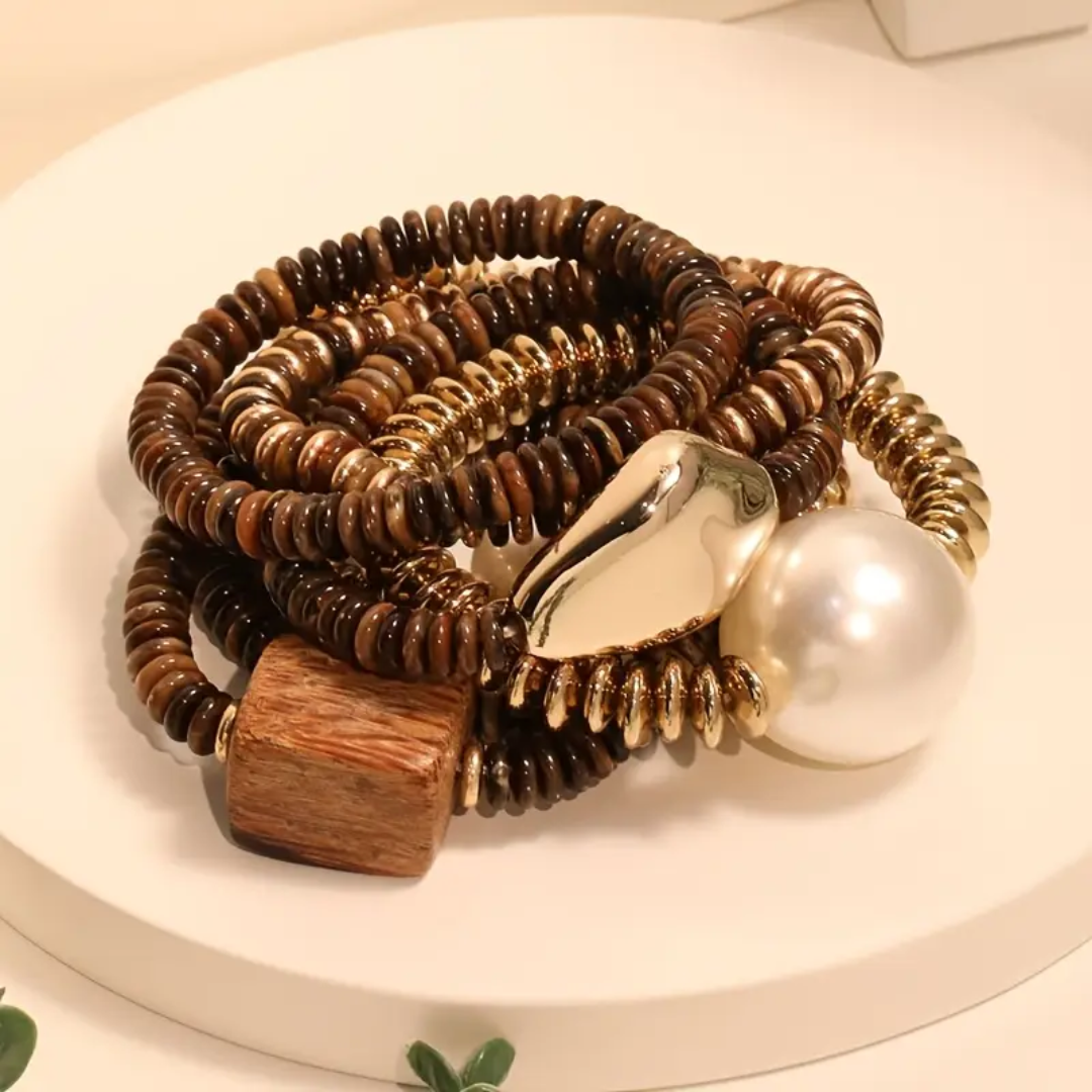 This multi-strand design features stacked wood beads, shimmering golden spacers, a bold cube of natural wood, and a luminous pearl centerpiece. The combination feels modern, tribal, and refined, making it an eye-catching piece that speaks of both grounding energy and elevated style.