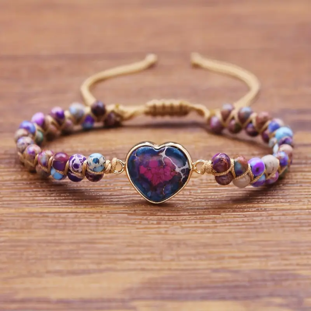 This bracelet features a stunning heart-shaped jasper centerpiece framed in gold, surrounded by polished multicolor jasper beads with unique natural patterns. The adjustable cord makes it comfortable and versatile, while its design feels romantic, artisanal, and full of soul.
