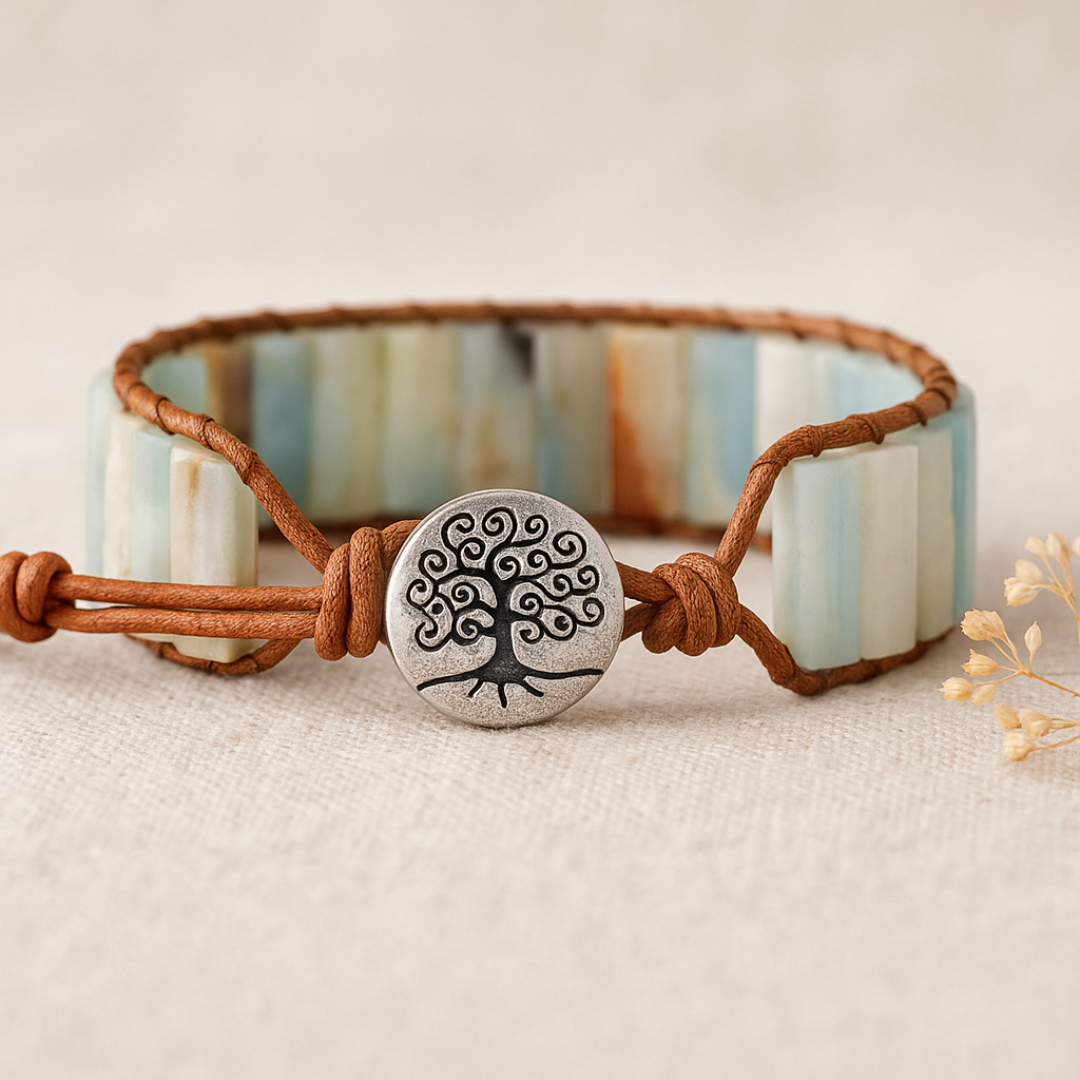 This splendid wrap bracelet is carefully handmade with natural semi-precious Amazonite stones and genuine leather.