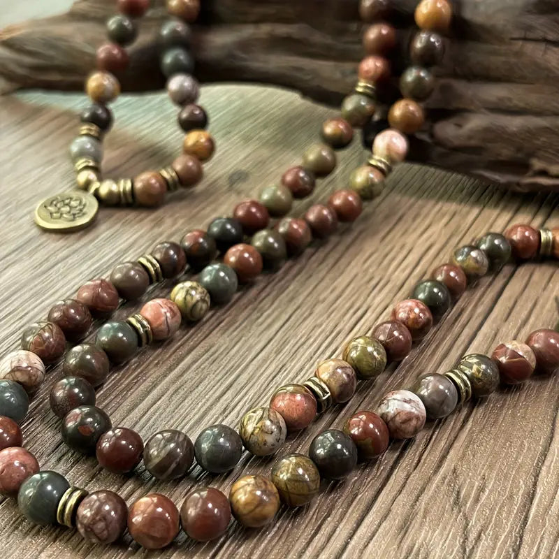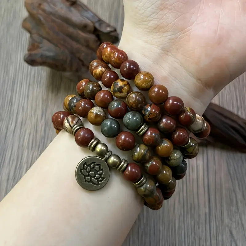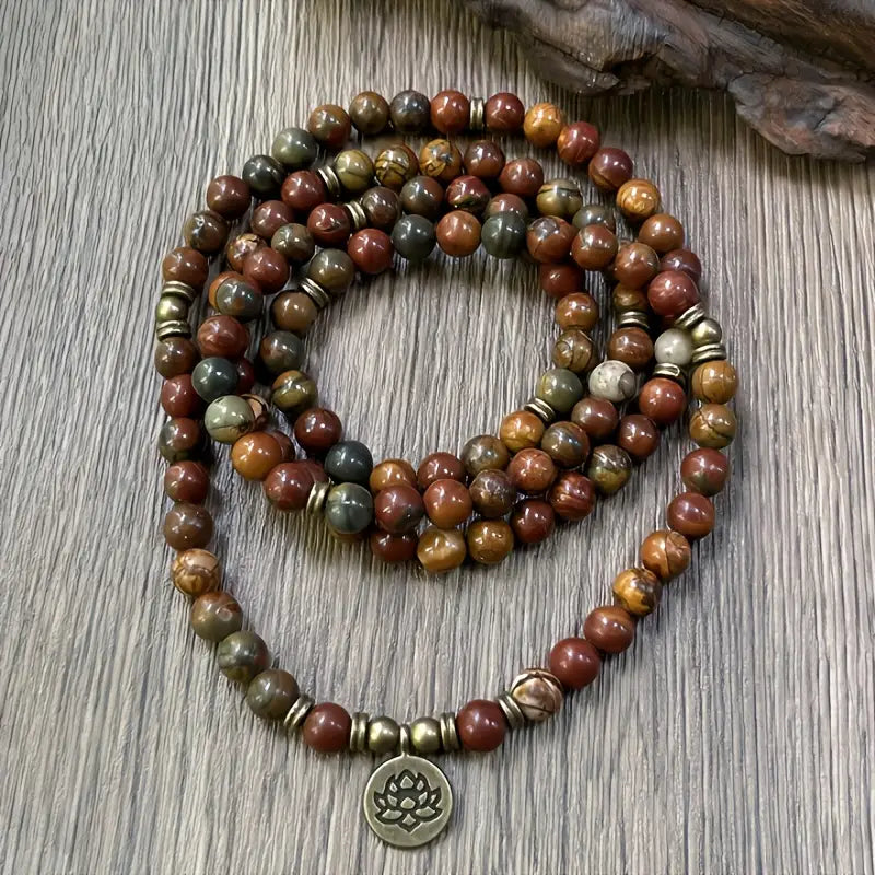 The Lotus Polychrome Jasper Bracelet is a powerful multi-layer design crafted with natural Polychrome Jasper beads and accented with a lotus charm. Its earthy tones—shades of red, green, brown, and beige— mirror the balance of nature and the cycles of renewal.