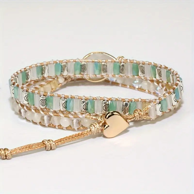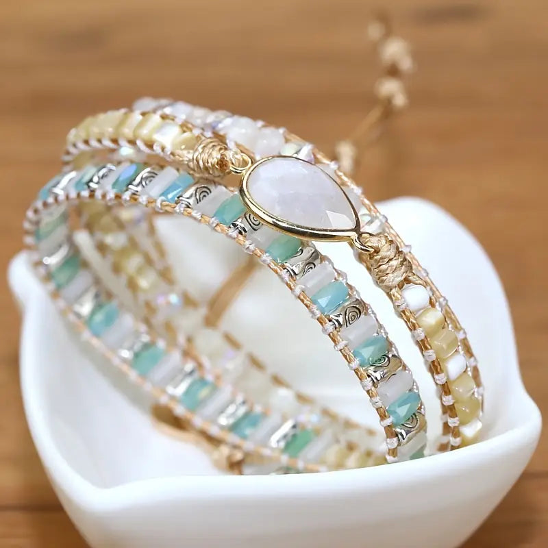 The Moonlight Harmony Bracelet is designed with luminous crystals, nacre beads, and a central moonstone-style gem framed in gold. Its wrap design combines elegance and boho charm, making it the perfect accessory to elevate any outfit.