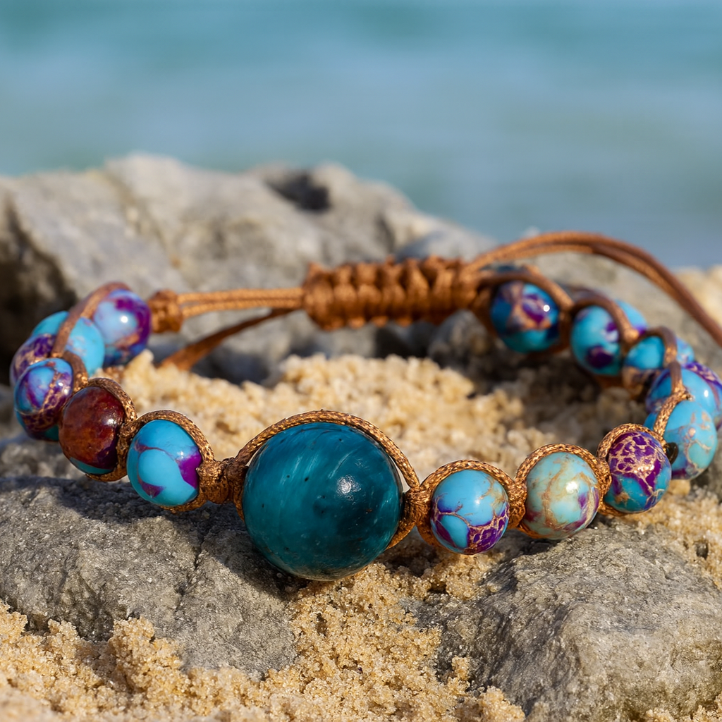 The Ocean Spirit Bracelet features a stunning blue central stone reminiscent of the deep sea, surrounded by colorful beads in purple, turquoise, and earthy tones. Its natural composition evokes tranquility, creativity, and a protective energy.