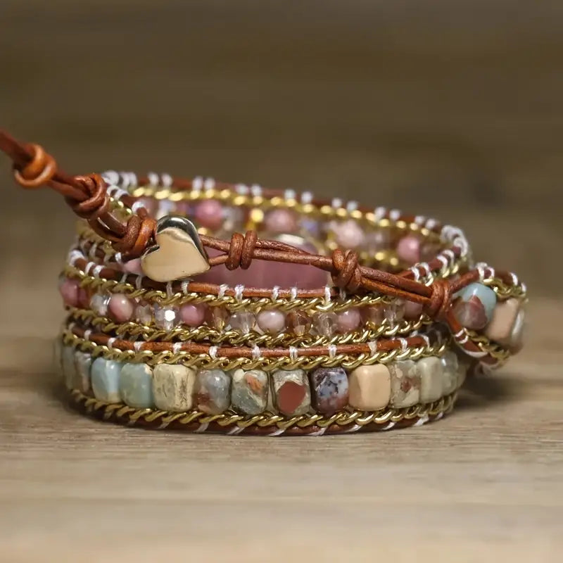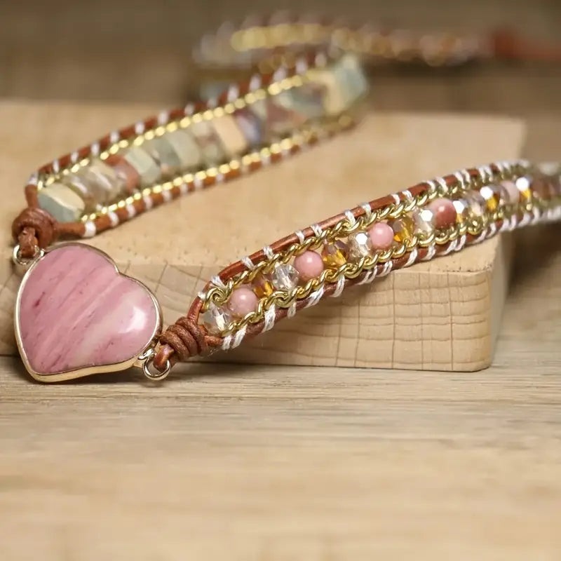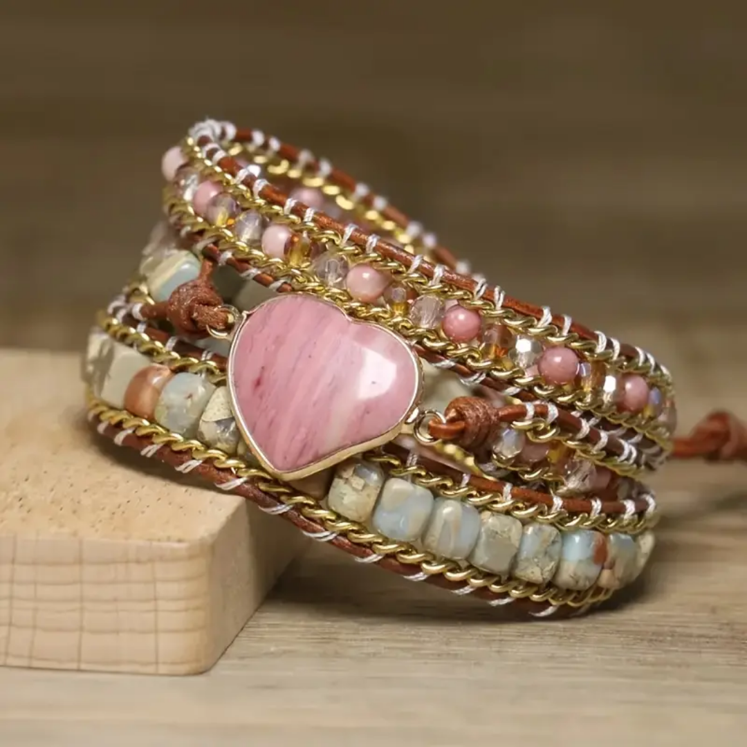 This elegant wrap bracelet highlights a central pink heart gemstone, delicately framed with natural crystals and earthy beads interwoven with golden details. Its blend of warm and pastel tones makes it a meaningful accessory full of charm and sophistication.