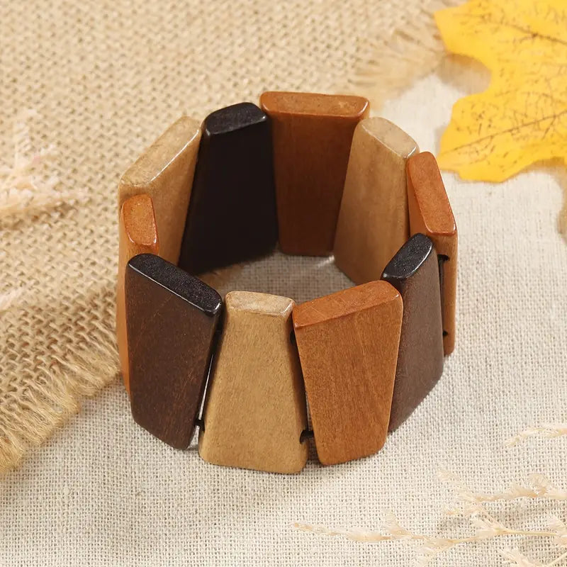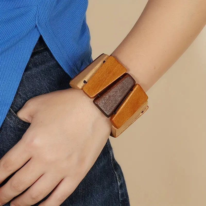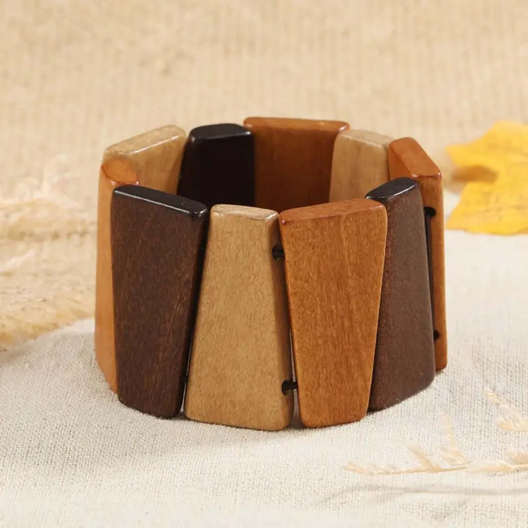 This bold cuff is crafted from natural wood segments in earthy tones of chestnut, beige, and ebony, forming a structured, geometric pattern. Its wide design feels authentic, tribal, and powerful, making it the perfect piece for those who embrace both strength and simplicity.