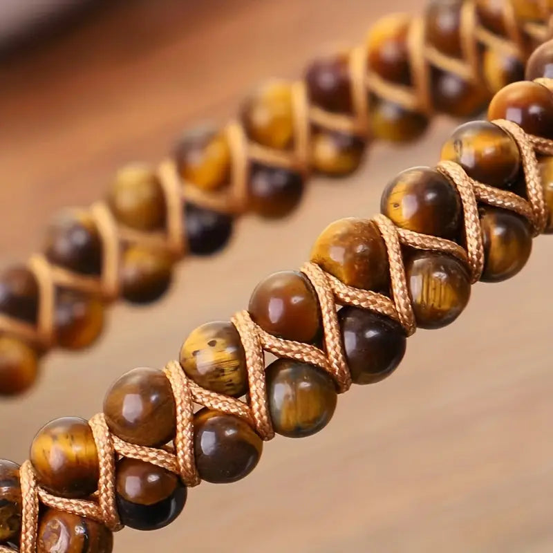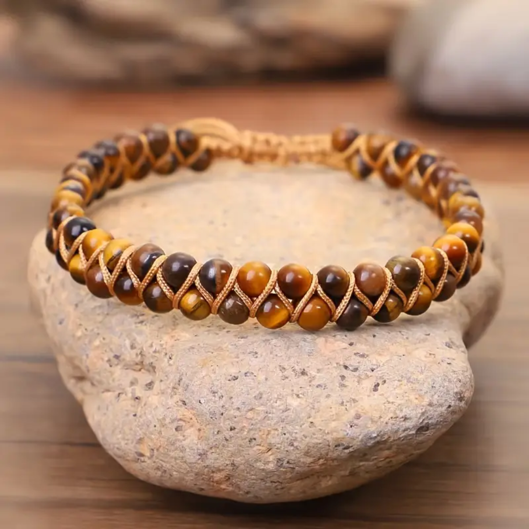 Each natural gemstone shimmers with golden and earthy tones, symbolizing the balance between sun energy and grounding earth. The braided golden cord adds durability and an artisan touch, making this bracelet as powerful as it is elegant.