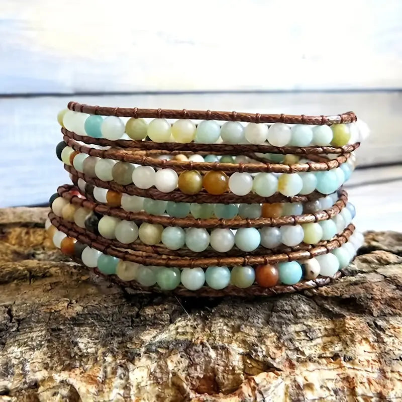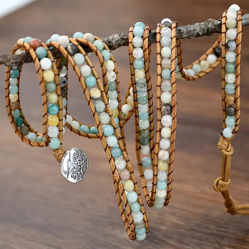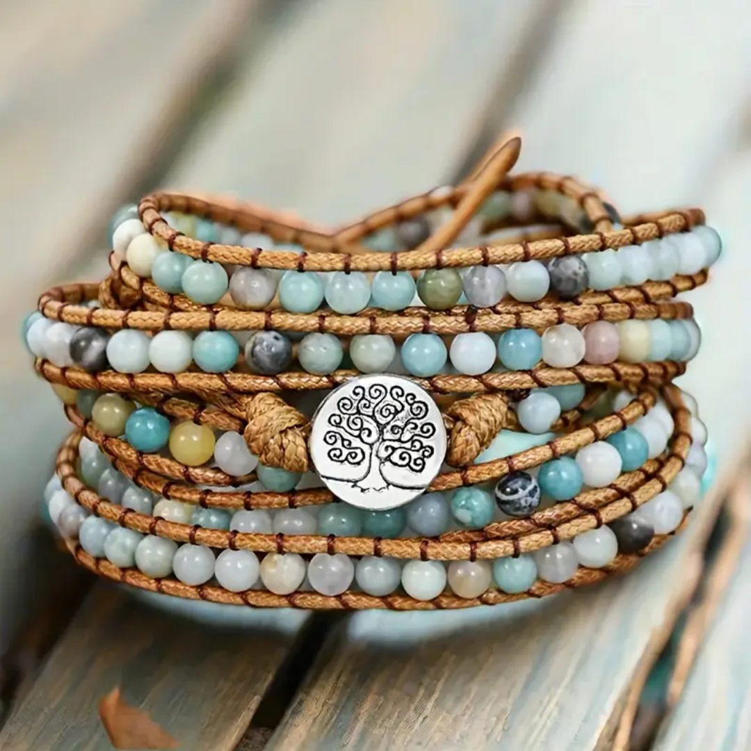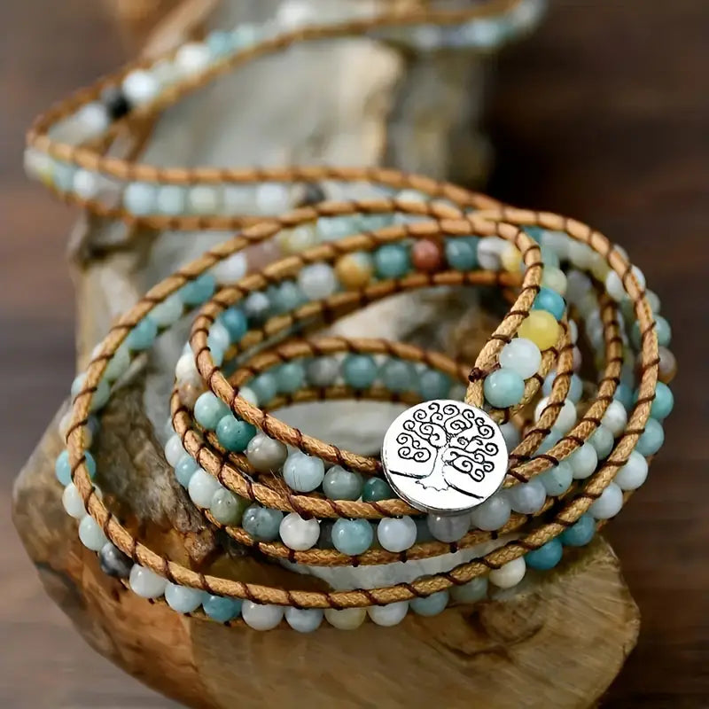 This multi-layer wrap bracelet is crafted with natural Amazonite and mixed gemstones, carefully woven into durable leather cords. The centerpiece features a Tree of Life charm, a universal symbol of growth, balance, and infinite connection.